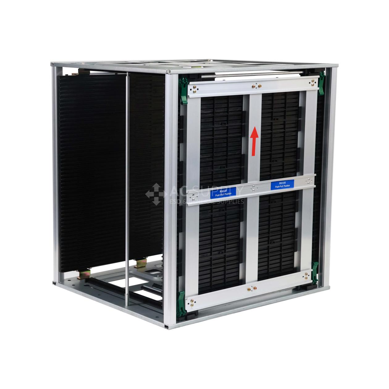 Rack ESD per l’alimentazione automatica di schede elettroniche in pick’n‘place, forni, macchine serigrafiche. Base metallo, pareti in plastica conduttiva con inforzi in alluminio. Regolazione micrometrica veloce su binario a cremagliera . PCB Slots nr. 50 – Slots Passo / 10mm – Profondità / 3,5mm – Larghezza / 5,0mm.