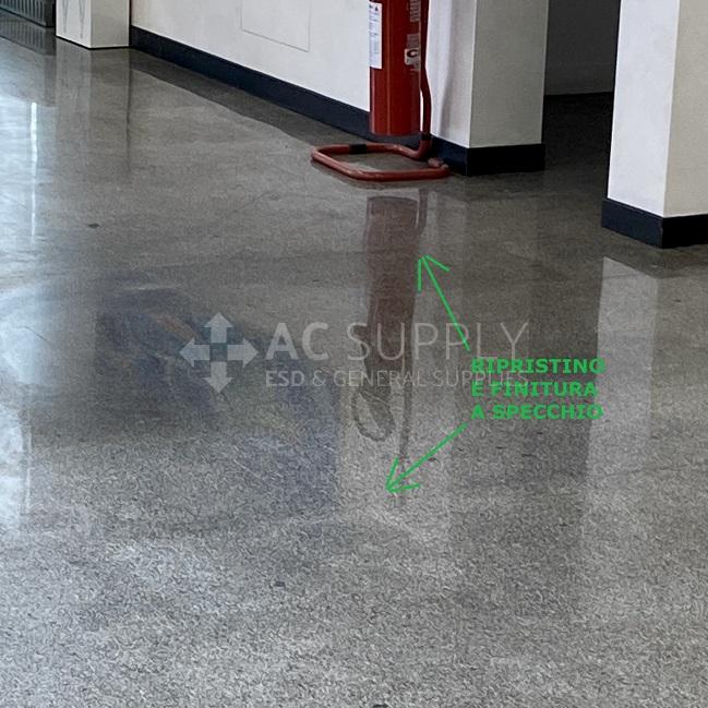 Demo of sanding with Bonastre abrasive discs and final + durable floor surface treatment Novagranit Gel. Main entrance of a cosmetic company with a 50 years old granite floor. Process with traditional single-brush machine in water bath and without dust generation and set of abrasive discs with finer and finer grit.