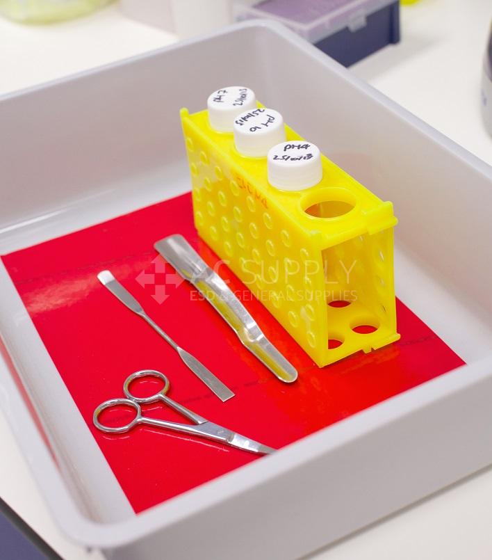 Non-slip anti-static roll and mat for workbench in production and laboratory departments. Absorbs vibration and stabilizes moving instruments, vials and test tubes. Adhesive on both sides without the need for adhesives and can be cut to size as an insert in boxes and containers for handling.