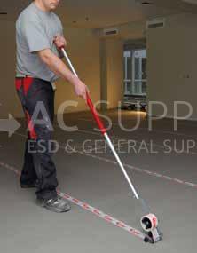 Tape dispenser for adhesive tapes and floor sign markings and fixing floorings (linoelum, carpet, pvc…) in an upright position. It features a foot-operated blade that allows you to unroll and cut the tape while standing. It can be used for all types of tape (including double sided tape) and takes up to 50mm wide and 200mm in diameter.