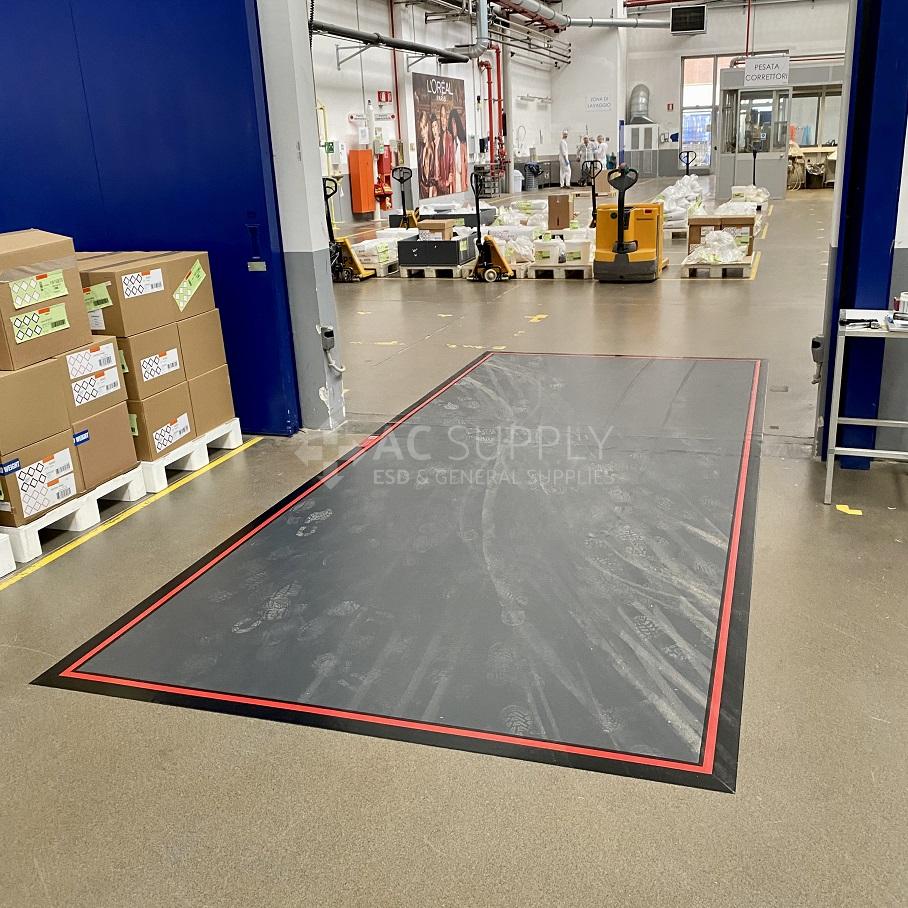 All’interno di un area produttiva di polveri, era necessario controllare la veicolazione di polveri a mezzo delle ruote e delle scarpe degli operatori che si muovono da un reparto all’altro. Sono, dunque, state indivuate 3 zone sensibili ed una anche all’interno de laboratori microbiologici. Le zone sono anche semplici da pulire con la lavasciuga dagli stessi operatori, quando sature. Come previsto la lunghezza del tappeto degli operatori rimane più lunga, 7 metri contro i 5, sempre per il fatto che la ruota rimane sempre a contatto mentre i passi sono distanziati ed occorre farne almeno 3 per gamba per garantire una rimozione dello sporco dalla suola.