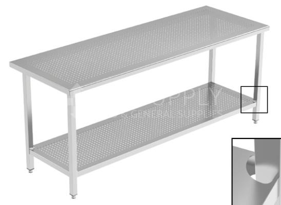 Disponibile con ripiano inferiore forellinato e saldato alla struttura. Piedini di livellamento.