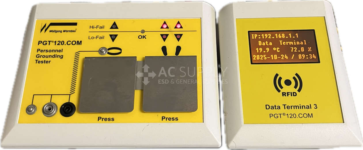 PGT-120 è una stazione di test per bracciali e calzature ESD, con elettrodo/pedana a piedi separati per un test simultaneo di accesso alle aree protette E.P.A.